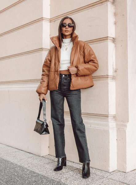 Сапоги – оптимальное решение зимой. Темные узкие джинсы отлично сочетаются с дубленкой и высокими черными сапогами. Если нужен лук с курткой-пуховиком, сапоги заменяют на угги.
